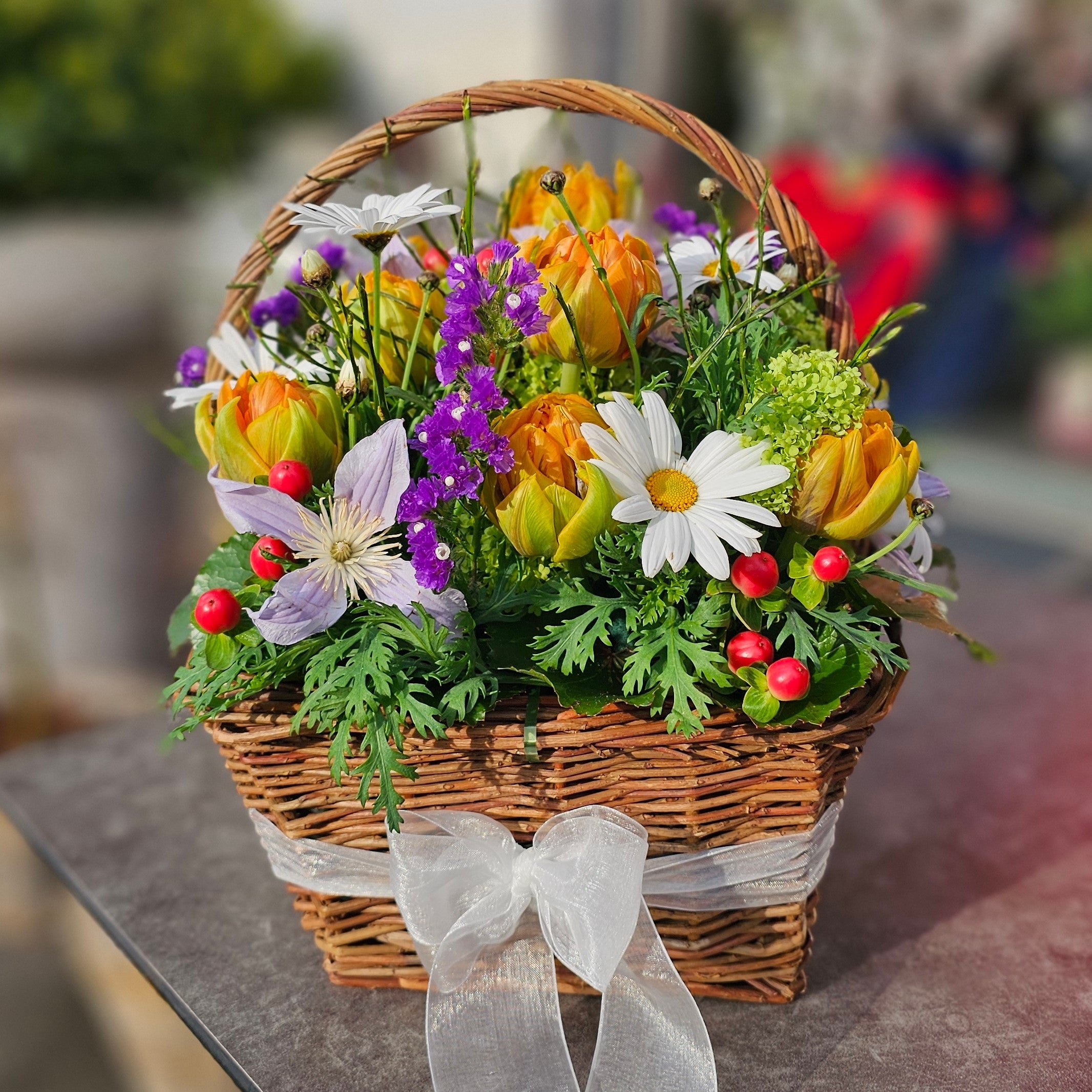 Our spring arrangement in a woven basket instantly brings warmth, color, and cheer to your home. Vibrant yellows and oranges meet delicate white and purple blossoms, creating a harmonious arrangement brimming with joie de vivre. It's ideal for saying thank you in spring, touching hearts, or simply giving the gift of joy. Each flower basket is freshly arranged and carefully assembled to ensure a genuine smile upon unwrapping. Perfect for anyone wanting to create a special moment.