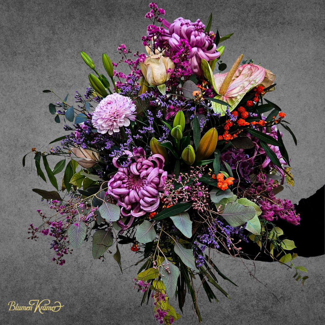 A fresh bouquet of delicate pink and violet hues, perfect for anyone looking to buy a special bouquet online. This seasonal arrangement combines elegant chrysanthemums, lilies, and lovingly selected seasonal blooms for a warm and harmonious effect. Ideal as a gift, for birthdays, thank-you notes, or as a high-quality home decoration.