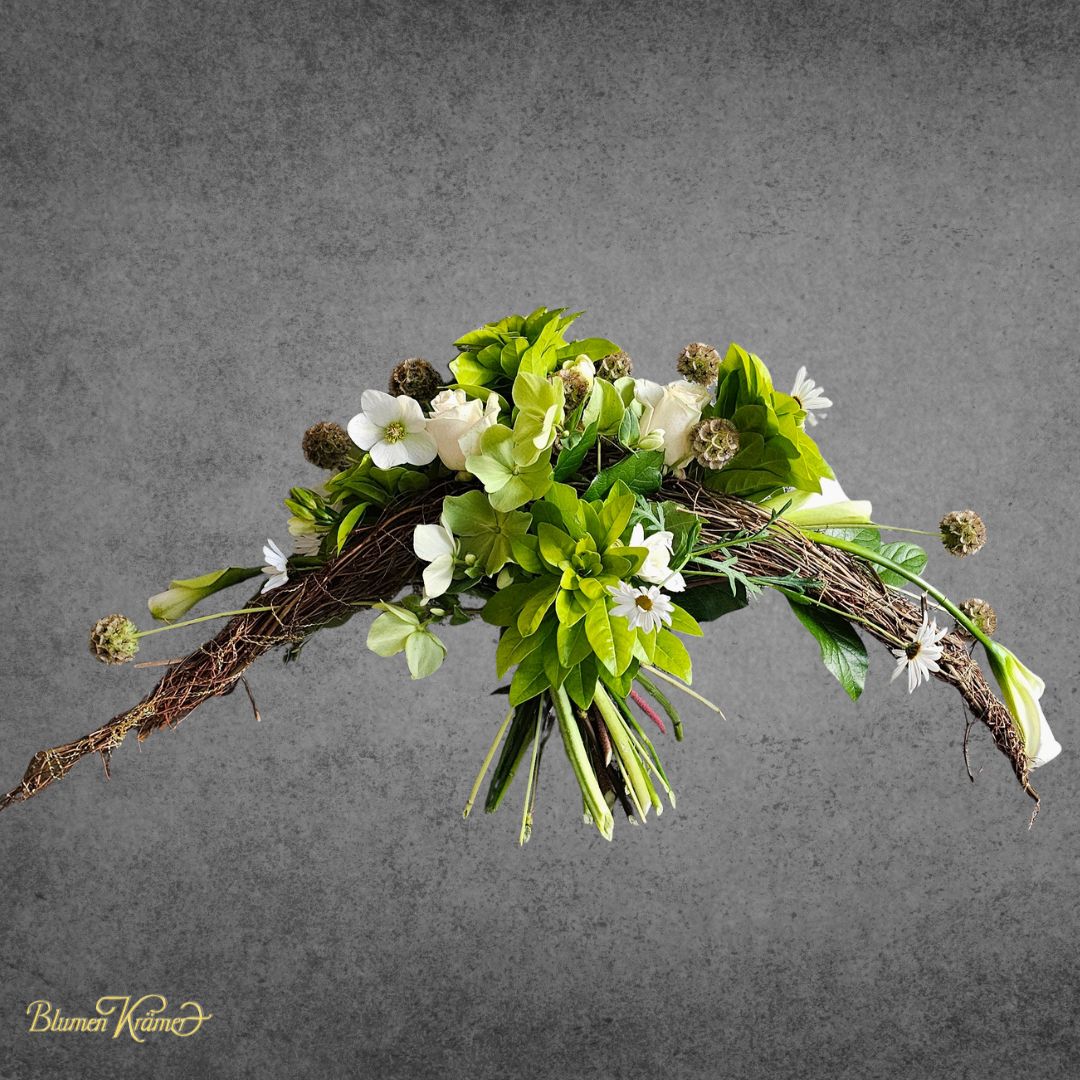 This natural bouquet impresses with its clean lines, fresh green tones, and light-colored blossoms. Delicate white flowers combined with fresh foliage and branches create a modern, serene, and elegant look. Ideal as a stylish touch in spring for the home, office, reception area, or as a personal gift.