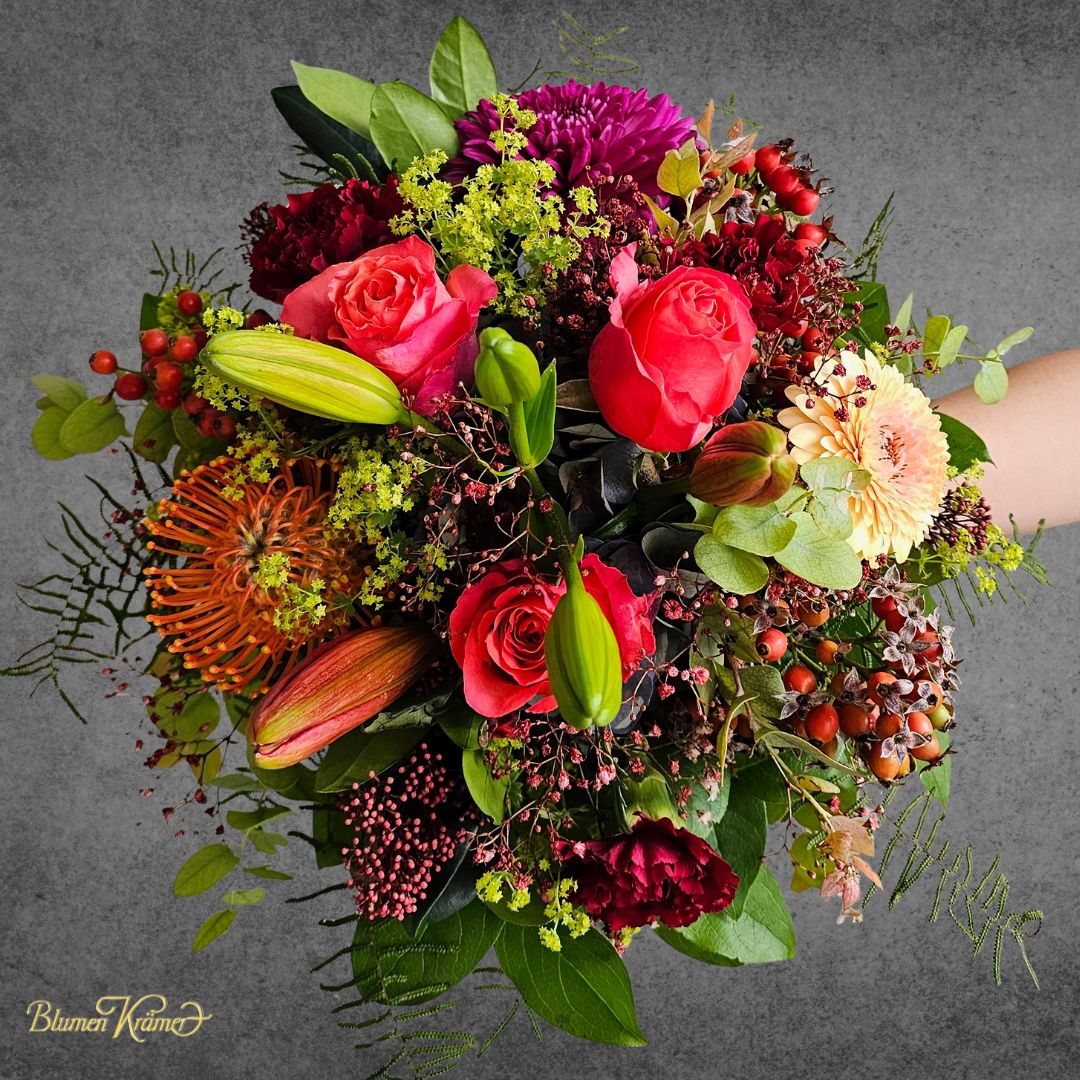 Immerse yourself in the splendor of autumn with our autumnal bouquet of vibrant roses, exotic blossoms, autumnal berries, and fresh greenery. Combining bold red tones with delicate pastel accents, this bouquet brings natural elegance to any home. Whether as a gift for a special someone or to treat yourself to a magical floral moment, this bouquet speaks volumes.