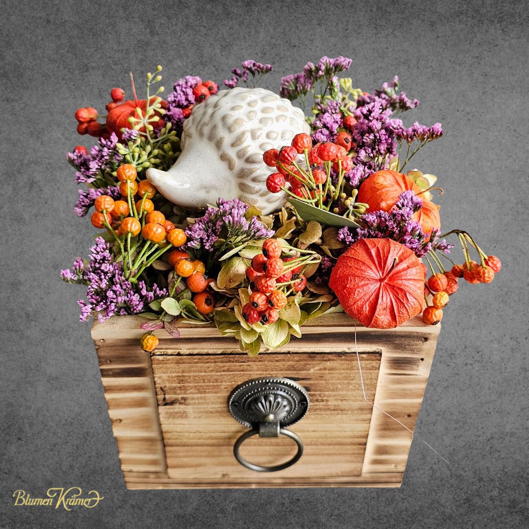 Autumnal flower arrangement with hedgehog figure in wooden box