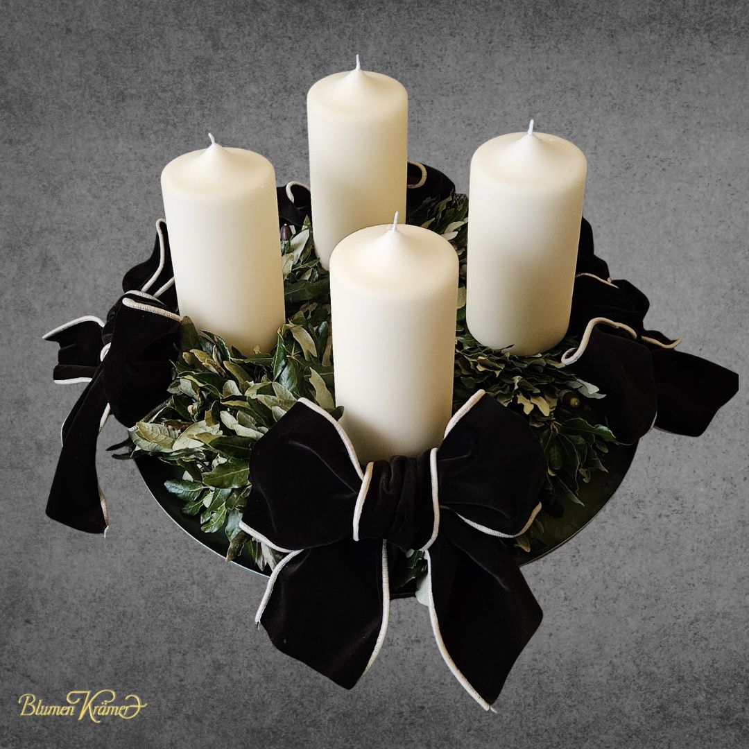 This elegant Advent wreath, crafted from fresh oak and featuring four cream-colored candles, brings a warm, festive atmosphere to any home. Ideal for those looking to purchase a high-quality Advent wreath online. With its velvety brown ribbons and natural green accents, it exudes both modern and traditional charm. The oak will dry naturally.