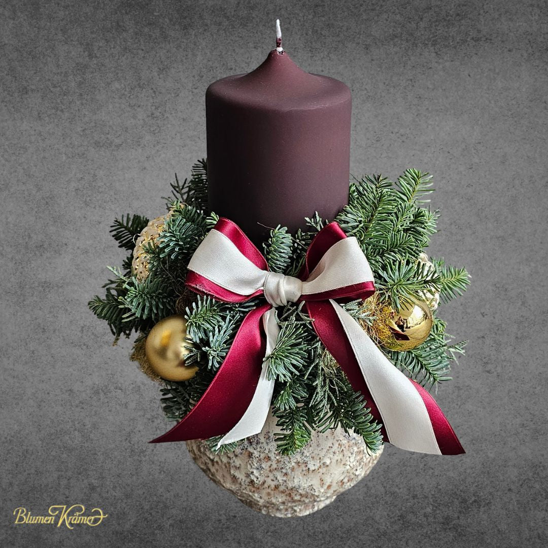 Dieses Kerzengesteck mit frischer Tanne goldenen Kugeln und einer rot weissen Masche bringt sofort elegante Weihnachtsstimmung in jedes Zuhause. Die ruhige Art wie das Kerzenlicht auf dem Gold reflektiert wirkt warm einladend und perfekt für alle die eine stilvolle aber nicht überladene Adventsdeko suchen. Diese Art von Arrangement wirkt zeitlos und veredelt jede Umgebung veredelt.