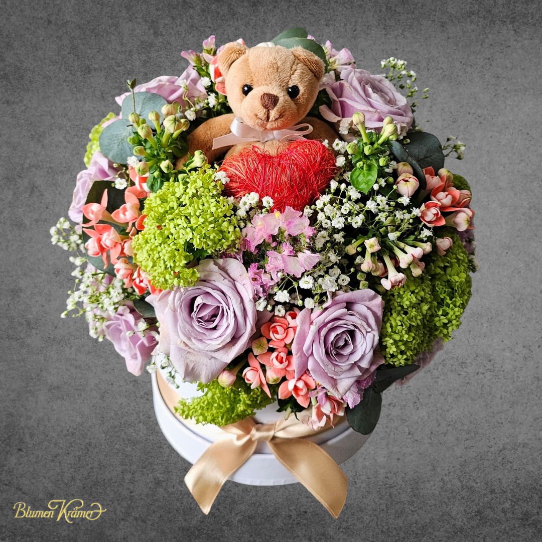 Unsere Blumenbox mit Teddybär Schlüsselanhänger ist das perfekte Geschenk. Zarte Rosen, frische saisonale Blüten und feines Beiwerk werden harmonisch in einer Box arrangiert. Der süsse Teddybär und das Herz machen dieses Arrangement zu einem emotionalen Highlight für besondere Anlässe.