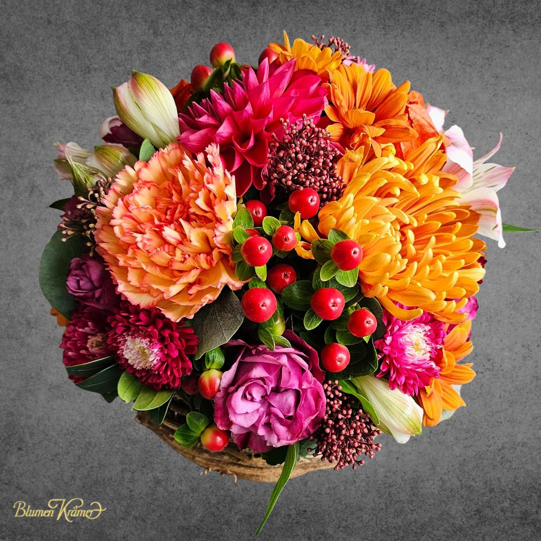 Blumenkorb mit herbstlichen Blumen, liebevoll arrangiert mit frischen Chrysanthemen, Hagebutten und saisonalem Beiwerk in leuchtenden Herbstfarben. Dieser herbstliche Blumengruss bringt Wärme und Farbe in Ihr Zuhause oder ist das perfekte Geschenk für einen besonderen Menschen. Jeder Korb wird in unserem Blumenladen in Zürich von Hand gestaltet und ist ideal für die herbstliche Dekoration. Jetzt herbstlichen Blumenkorb online kaufen und florale Herbstfreude direkt nach Hause liefern lassen, schnell, lokal und mit Liebe gemacht.