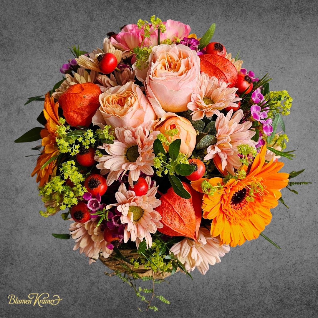 Unser herbstliches Blumenkörbli ist mit viel Liebe aus bunten Saisonblumen zusammengestellt wie darunter Chrysanthemen, Hagebutten, Lampionblumen und weitere herbstliche Blüten. Die leuchtenden Farben von Orange, Rot und Lachs bringen Wärme und Farbe in die dunkler werdenden Tage. Ideal als kleiner Blumengruss im Herbst, ob fürs Büro, Zuhause oder als Geschenk an liebe Menschen.