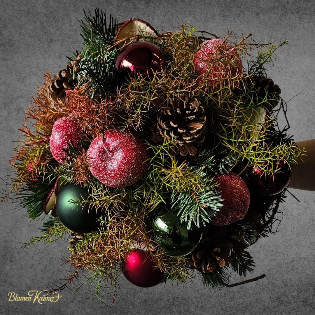 Dieser weihnachtliche Strauss vereint natürliche Eleganz und festliche Farben. Glitzernde Äpfel, dekorative Zapfen, frische Koniferen und leuchtende Kugeln in Rot und Grün schaffen ein stimmungsvolles Arrangement voller Adventszauber. Jeder Blick auf diesen Strauss weckt Vorfreude und bringt festliche Wärme ins Zuhause. Ideal als Geschenk oder als elegante Tischdekoration.